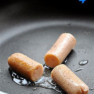 Bước 2: Xúc xích cắt đôi. Đun nóng 1 muỗng canh dầu ăn rồi cho xúc xích vào chiên sơ qua. Khi xúc xích săn lại thì rắc lên 1/4 muỗng cà phê tiêu, đảo đều rồi tắt bếp.